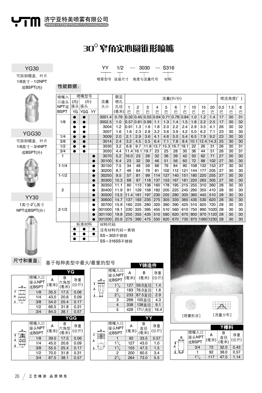 喷雾型号YH  连接尺寸 1/2 角度与流量代号3030  材料 S316